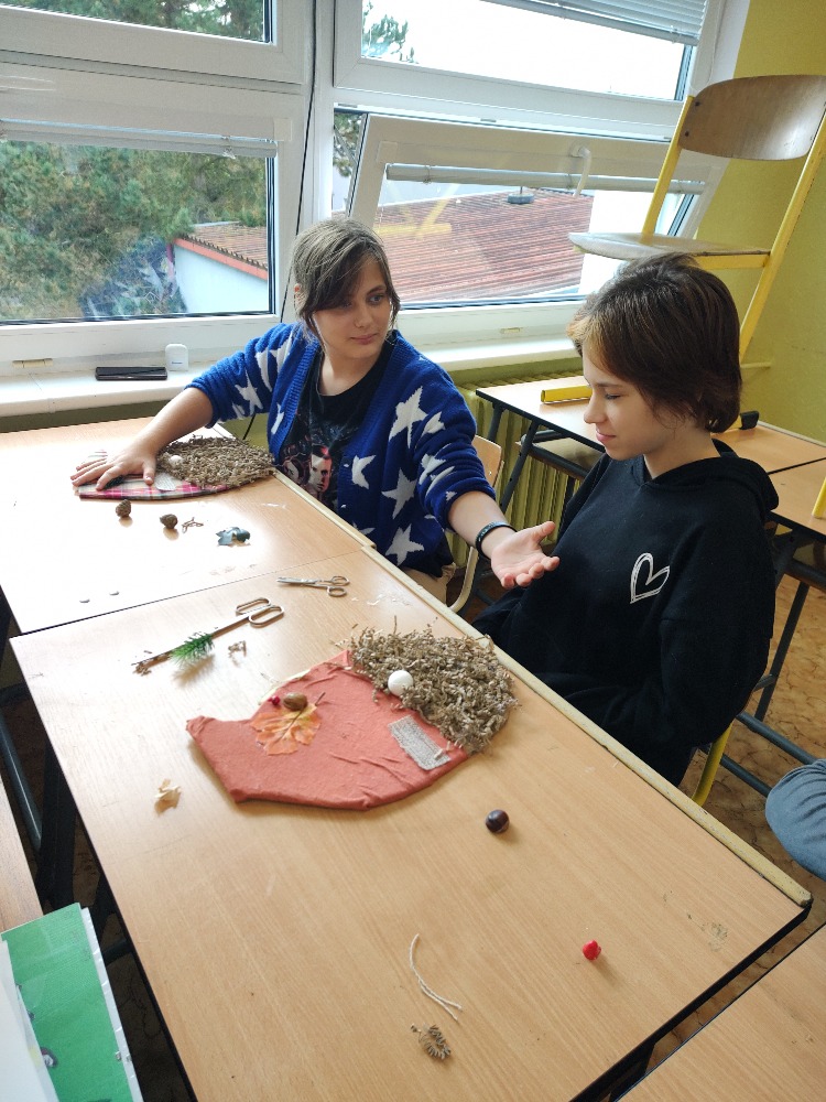 V září jsme se začali v “Duhovce” věnovat podzimní výzdobě. Ve 3 lekcích jsme si vytvořili dva skřítky. Jeden poslouží na dveře a druhý na parapet okna či na stůl. Zopakovali jsme si tak zásady aranžování s tavnou pistolí, pracovali s přírodninami, textilem i barvou. Obyčejná krabice, zbytky starého oblečení, balíkové výplně, prázdná láhev a pár přízdob a máme krásnou výzdobu.