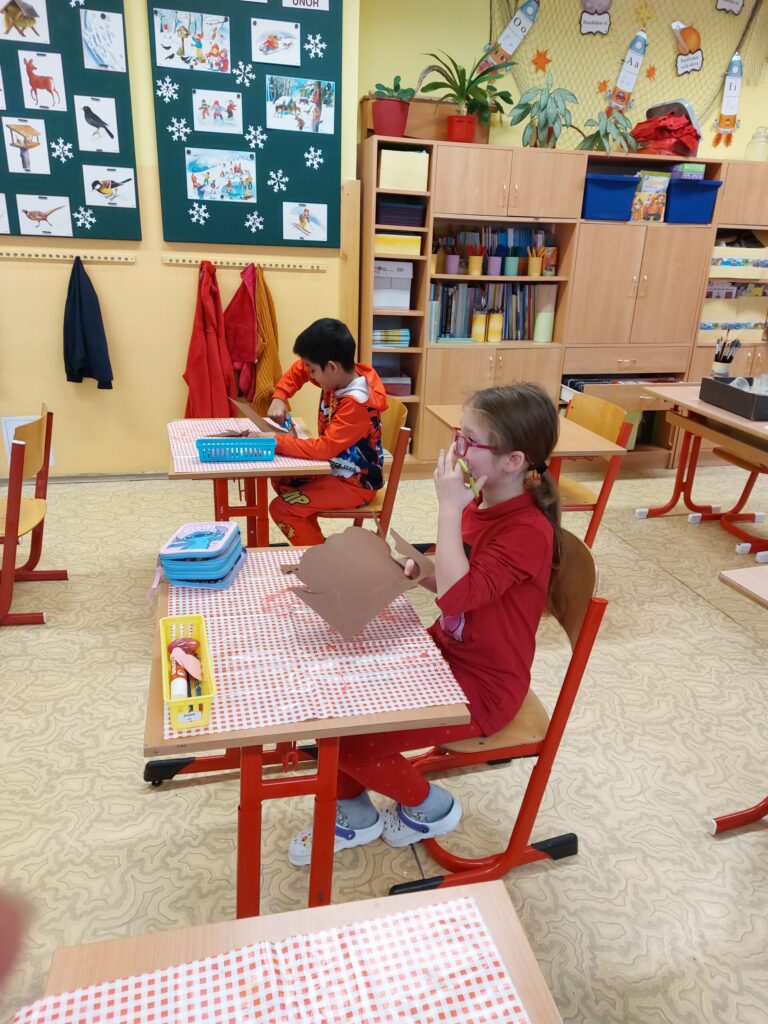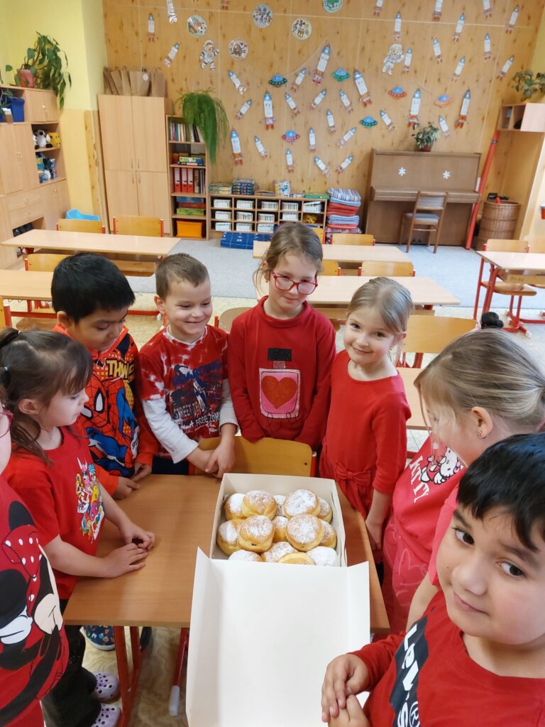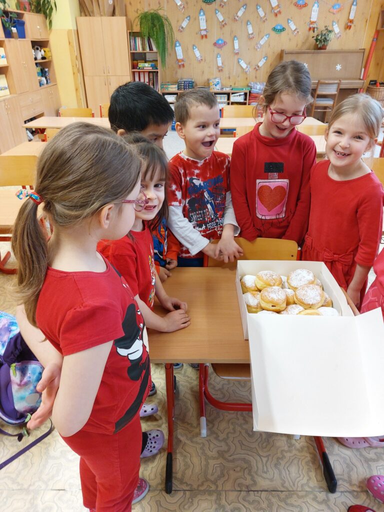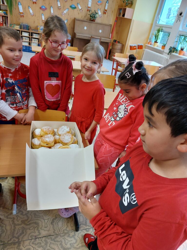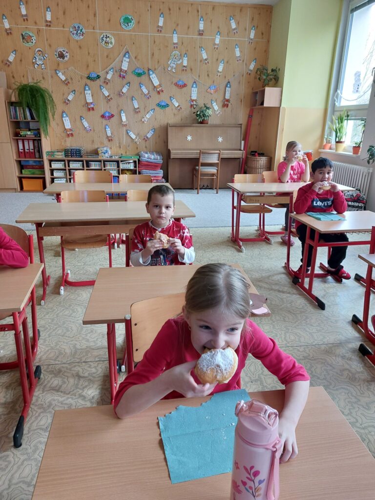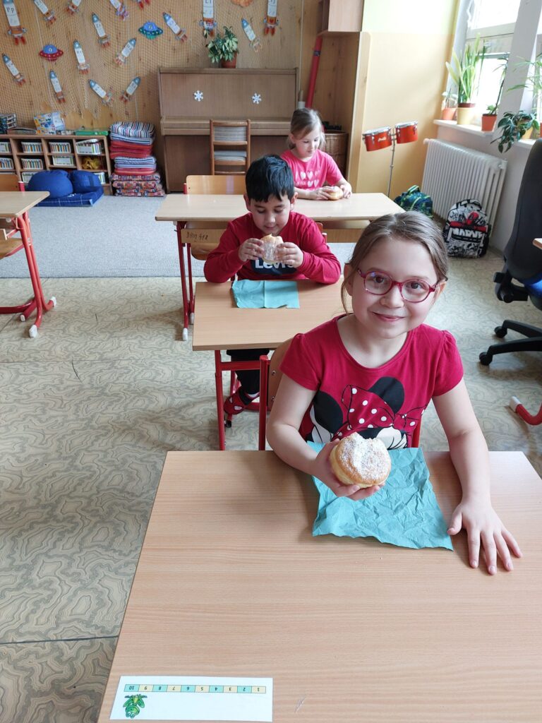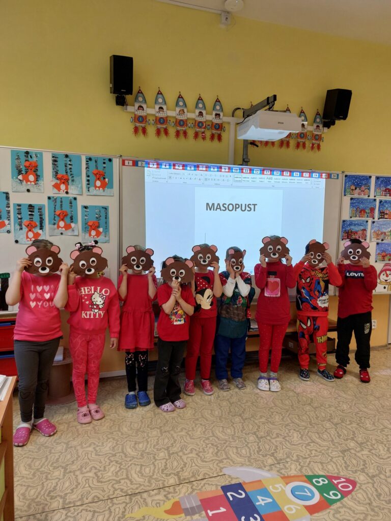 Tento týden jsme zakončili vesele a sladce. Paní učitelka si pro nás připravila vyprávění o tom, jak naši předkové trávili čas v zimě. Jak se veselili a jaké měli zvyky a co to je masopust. Při tvořivých činnostech jsme si namalovali masku kobyly a potom si vyrobili masku medvěda. Protože k masopustu patří i dobroty, čekalo na nás i sladké překvapení. Dostali jsme plnou krabici koblížků. A aby nám víc chutnaly, pustila nám paní učitelka pohádku. Jakou? No, přeci pohádku Jak to bylo o masopustu.
