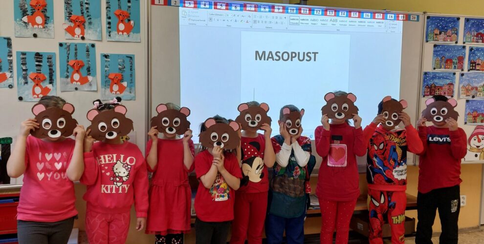 Tento týden jsme zakončili vesele a sladce. Paní učitelka si pro nás připravila vyprávění o tom, jak naši předkové trávili čas v zimě. Jak se veselili a jaké měli zvyky a co to je masopust. Při tvořivých činnostech jsme si namalovali masku kobyly a potom si vyrobili masku medvěda. Protože k masopustu patří i dobroty, čekalo na nás i sladké překvapení. Dostali jsme plnou krabici koblížků. A aby nám víc chutnaly, pustila nám paní učitelka pohádku. Jakou? No, přeci pohádku Jak to bylo o masopustu.
