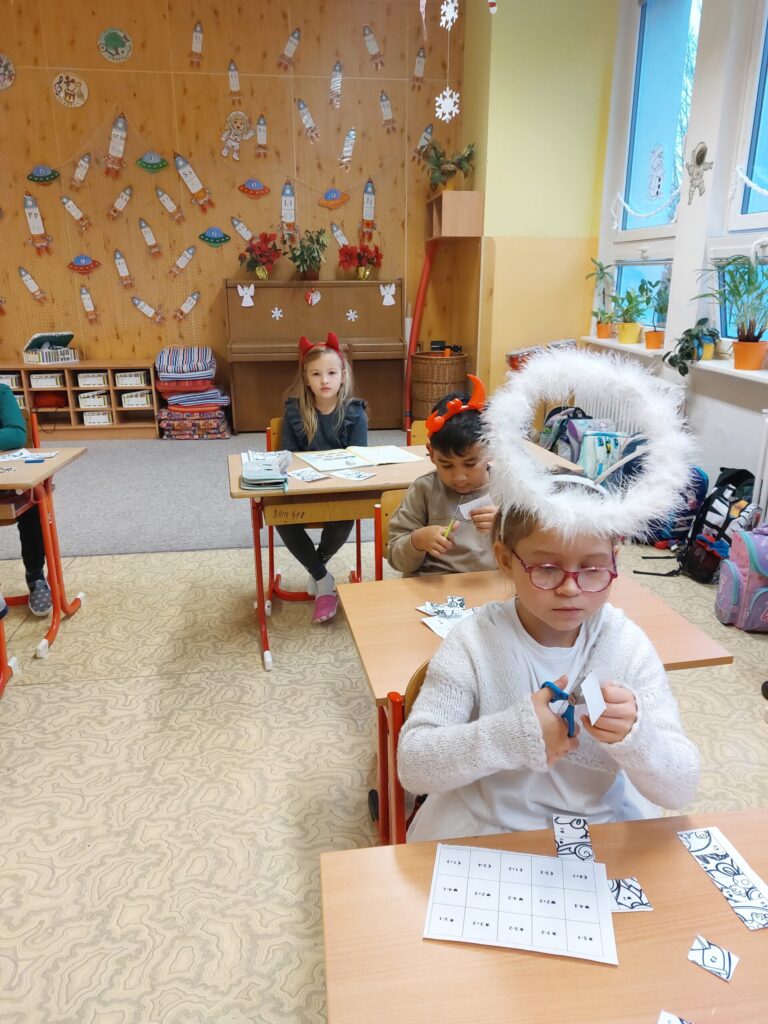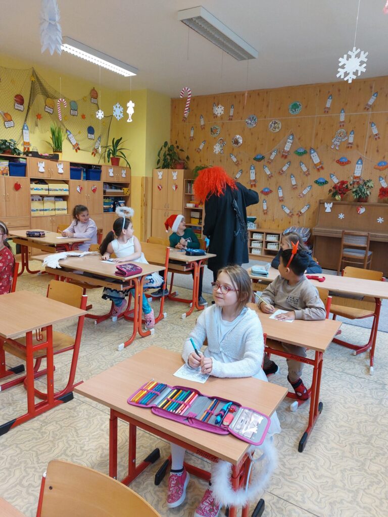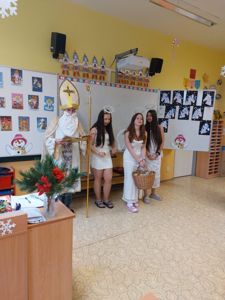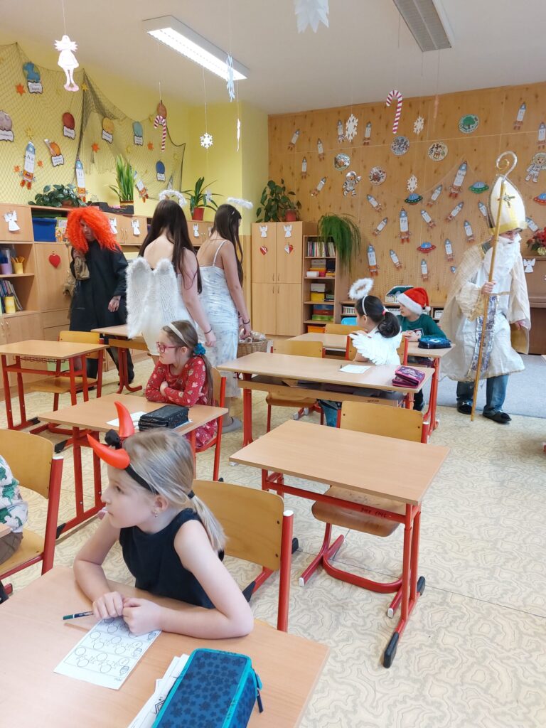 V pátek 5. prosince nás ve třídě navštívil Mikuláš se svými pomocníky, čertem a anděly. Někteří z nás se trochu báli, ale čerti byli hodní a nikoho si do pekla neodnesli. Naopak andělé nám všem rozdali lízátko a bonbony, takže nakonec panovala skvělá nálada. Mikuláš, čerti i andělé se stali součástí našeho vyučování. V matematice jsme počítali s čertovskými příklady a ve výtvarné výchově jsme tvořili obrázky inspirované touto tradicí. Celé „čertovské“ dopoledne jsme si opravdu užili a odcházeli jsme s úsměvem na tváři.