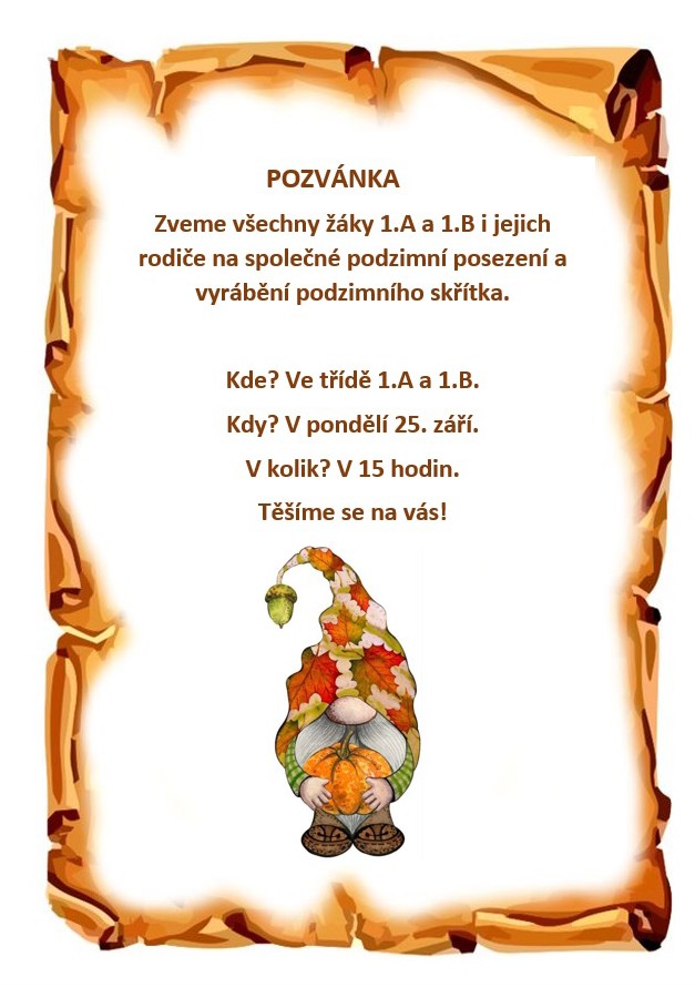 Zveme všechny žáky 1.A a 1.B i jejich rodiče na společné podzimní posezení a vyrábění podzimního skřítka.
