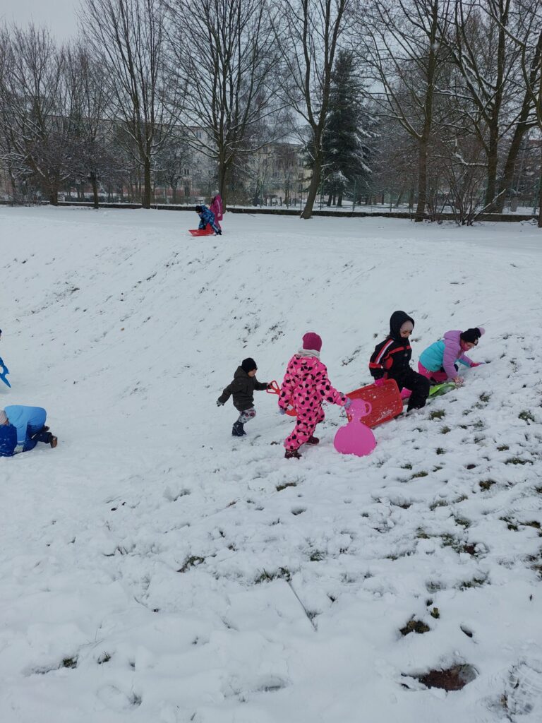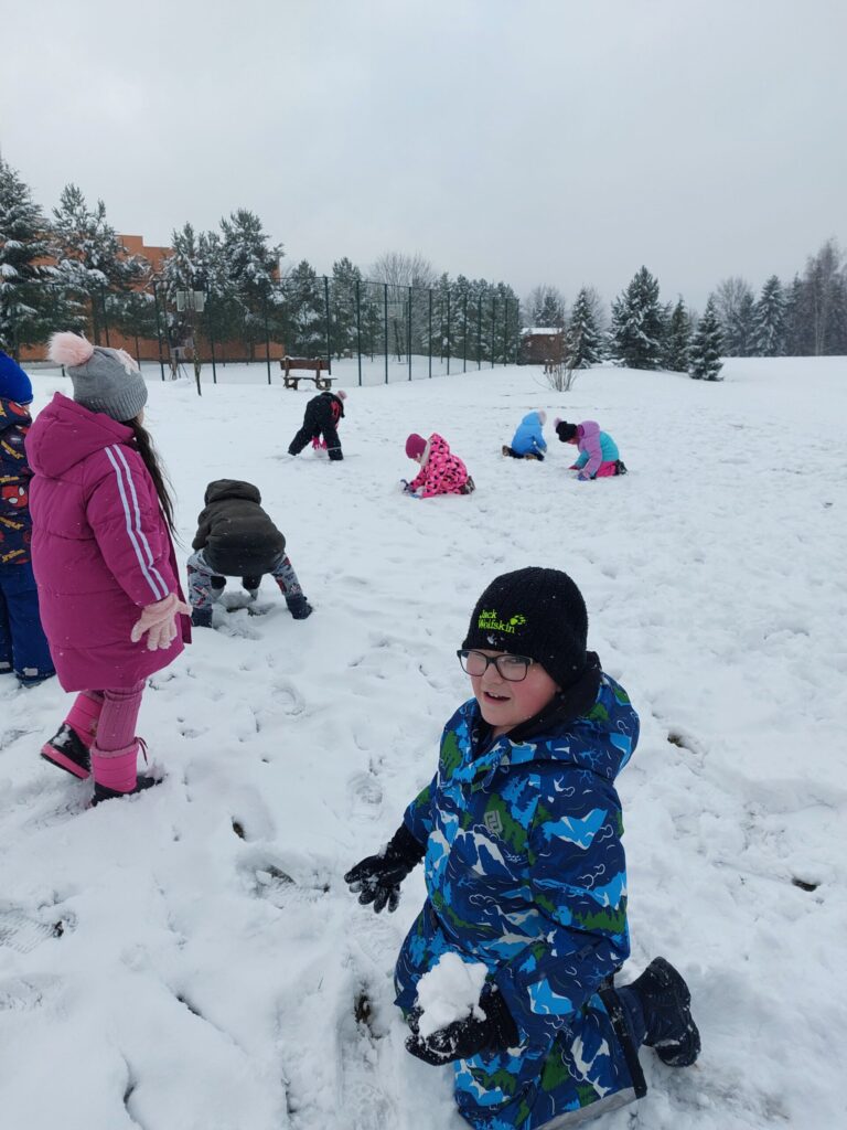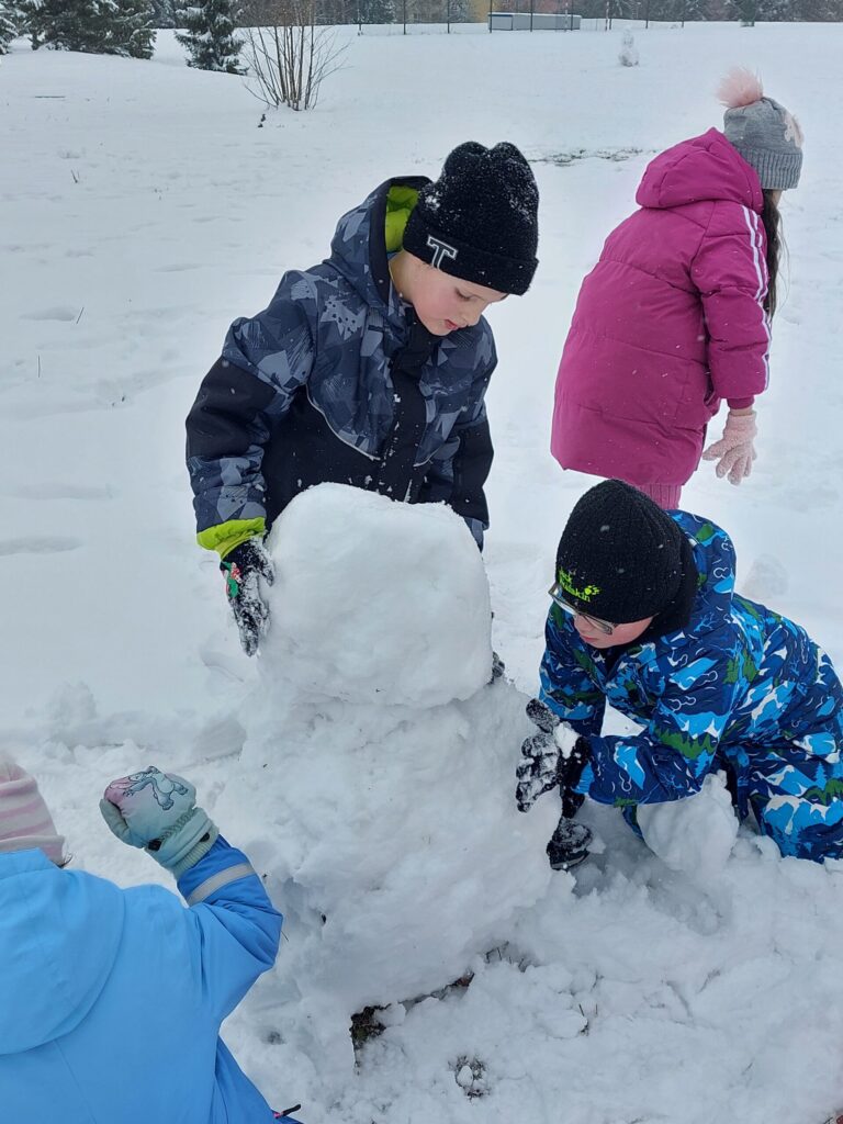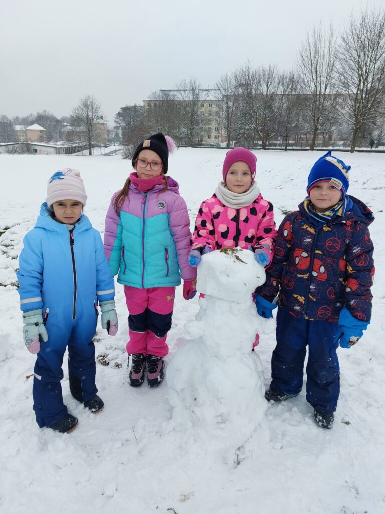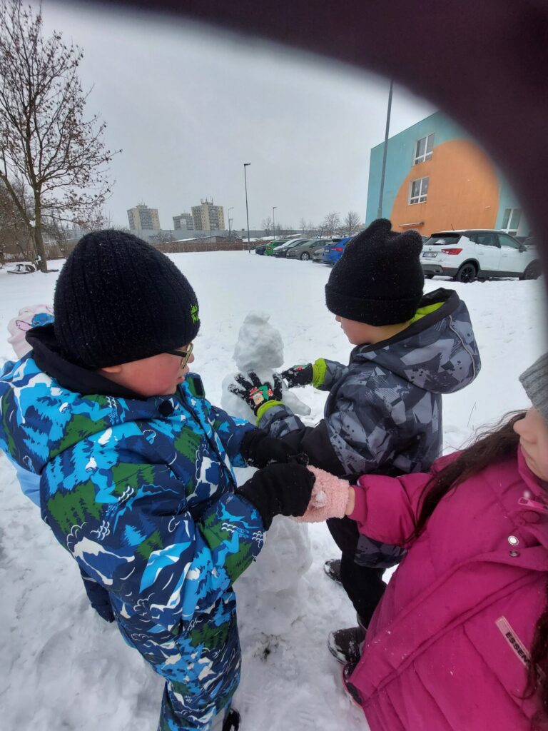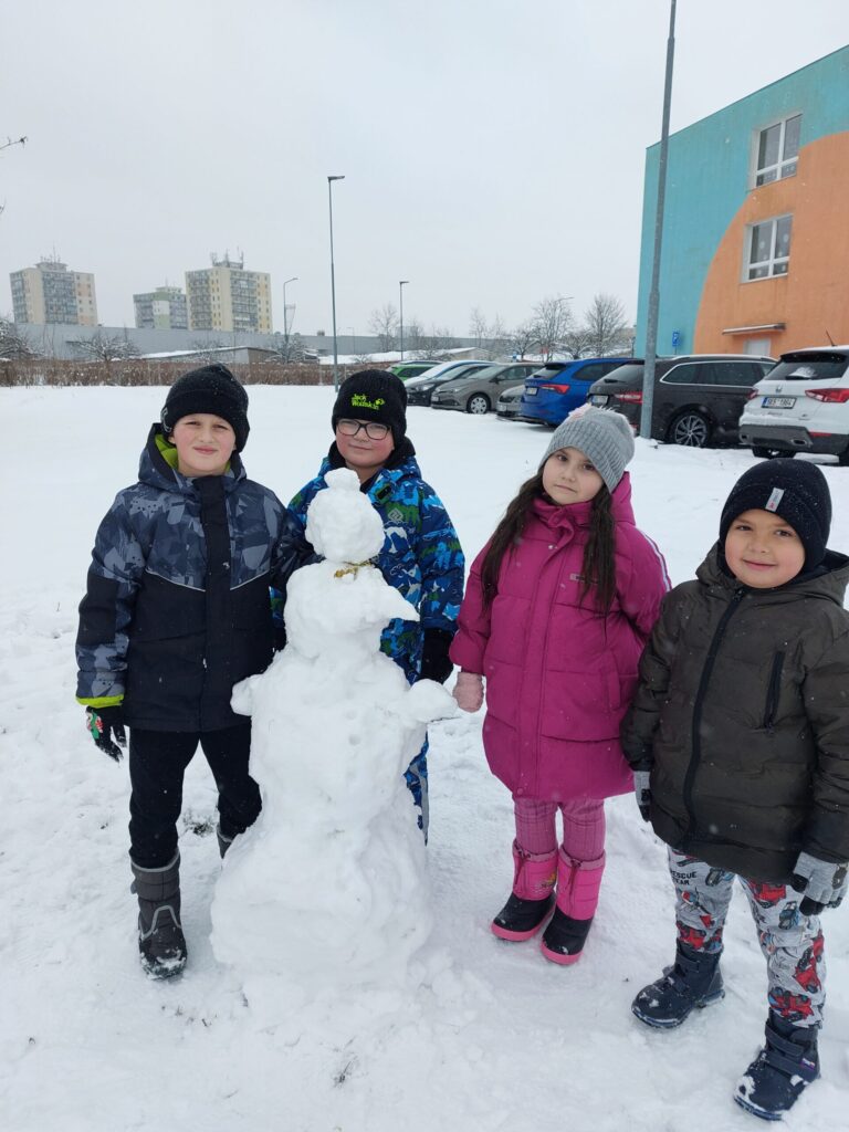 Poslední den prvního pololetí jsme si opravdu užili. Nejen proto, že jsme dostali naše první vysvědčení, ale také díky sněhové peřině, která pokryla celé okolí školy včetně kopečků za hřištěm. Do školy jsme tak tentokrát nepřišli jen s deskami na vysvědčení, ale i s teplým oblečením a boby. Hodina tělesné výchovy se proměnila v zasněžené bojiště, kde vzduchem létaly sněhové koule. Zasněžená plocha školního hřiště se proměnila v bobovou dráhu, na které jsme soutěžili, kdo dojede nejdál. Na závěr jsme společně postavili sněhuláky, kteří nyní hlídají naši školu. Škoda, že vydrží jen do prvních teplejších slunečních paprsků.