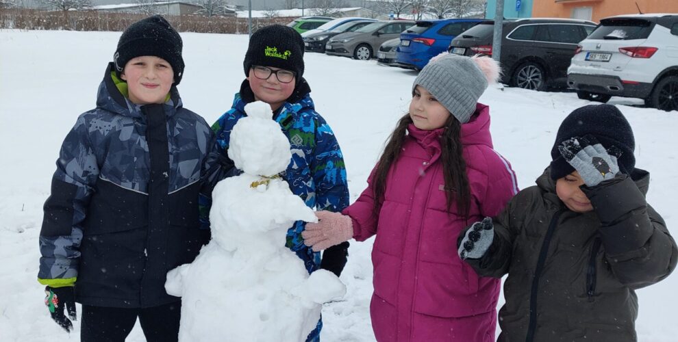 Poslední den prvního pololetí jsme si opravdu užili. Nejen proto, že jsme dostali naše první vysvědčení, ale také díky sněhové peřině, která pokryla celé okolí školy včetně kopečků za hřištěm. Do školy jsme tak tentokrát nepřišli jen s deskami na vysvědčení, ale i s teplým oblečením a boby. Hodina tělesné výchovy se proměnila v zasněžené bojiště, kde vzduchem létaly sněhové koule. Zasněžená plocha školního hřiště se proměnila v bobovou dráhu, na které jsme soutěžili, kdo dojede nejdál. Na závěr jsme společně postavili sněhuláky, kteří nyní hlídají naši školu. Škoda, že vydrží jen do prvních teplejších slunečních paprsků.
