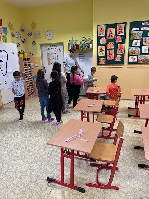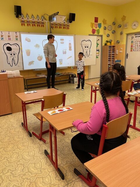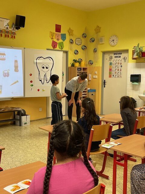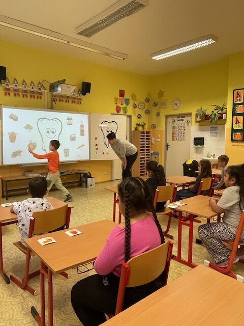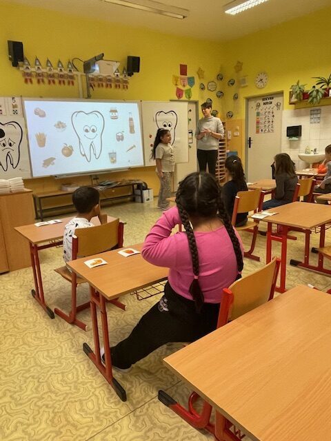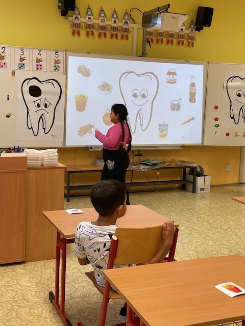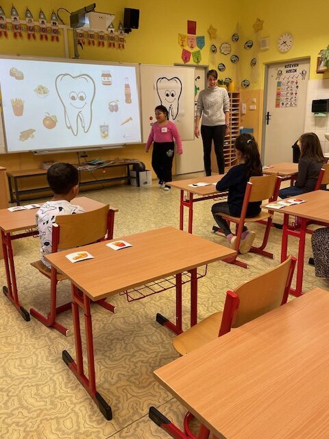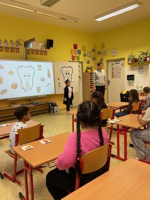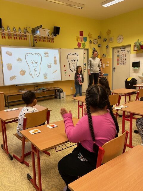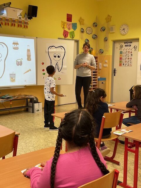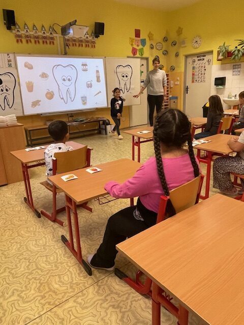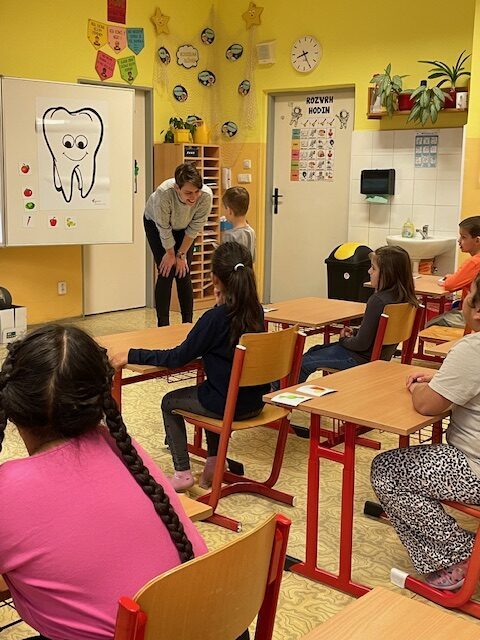V minulém týdnu za námi do školy přišly dvě paní zubařky, aby nám ukázaly, jak se máme správně starat o své zoubky. Připomněly nám, které potraviny jsou zdravé a které našim zoubkům škodí. Všichni jsme dostali zubní kartáček a společně s paní doktorkou jsme si správně vyčistili zoubky. Zoubky si musíme čistit pravidelně každé ráno a večer, aby byly zdravé a my jsme měli krásný úsměv. Také už víme, že nemusíme mít vůbec žádné obavy z návštěvy zubaře v jeho ordinaci.