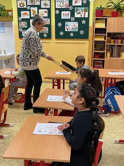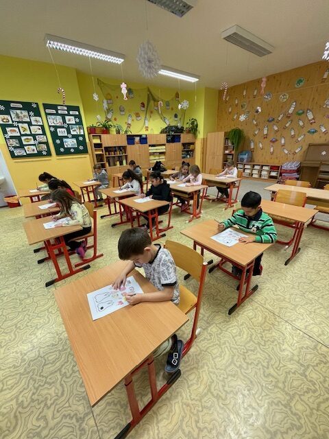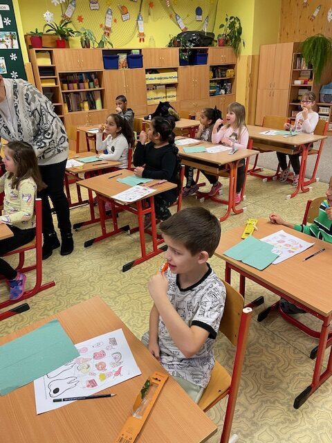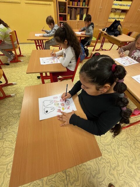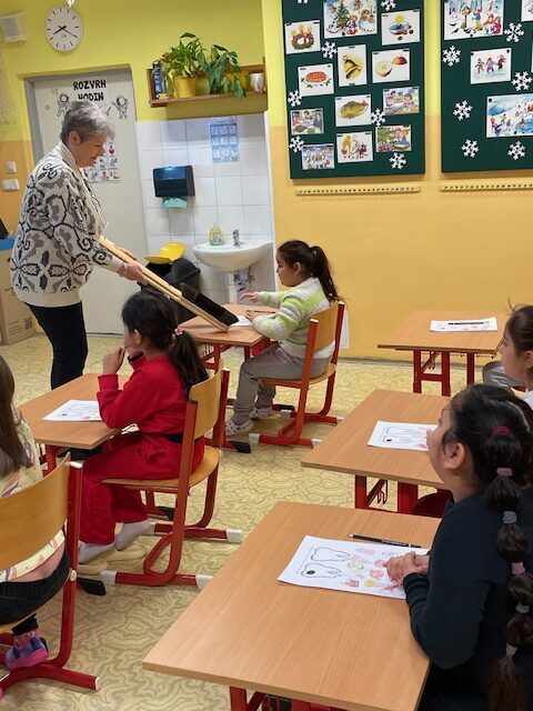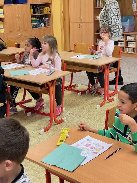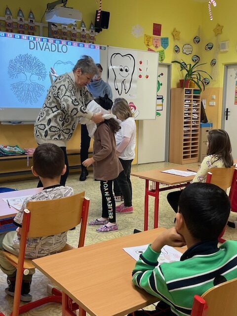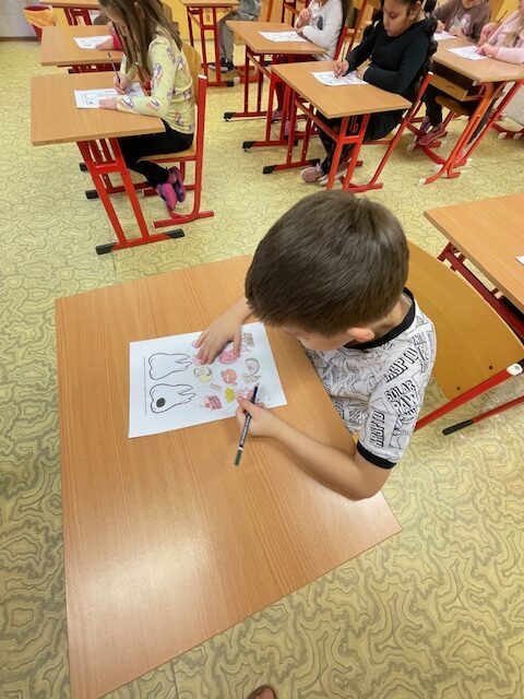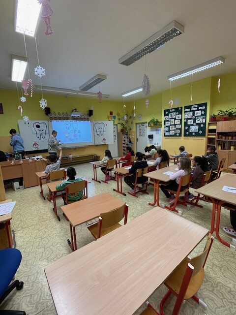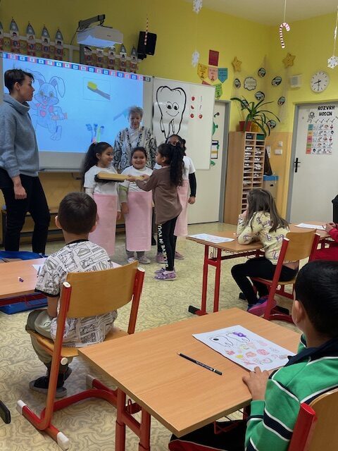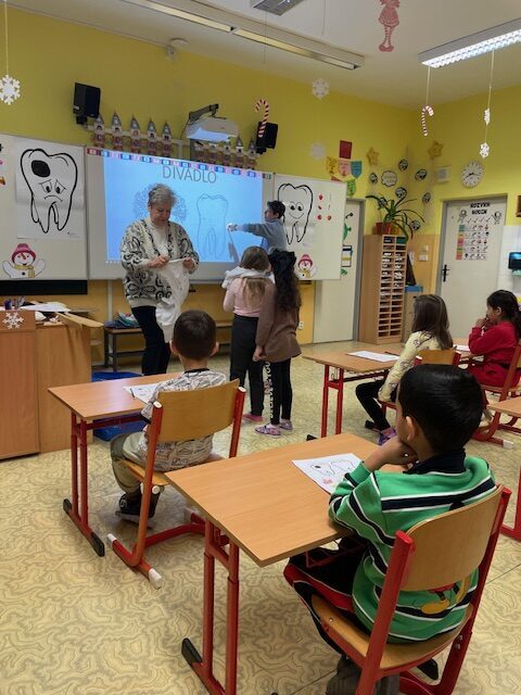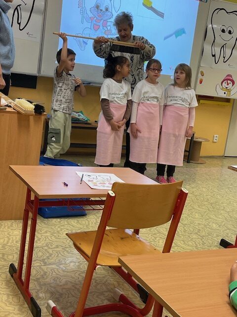 Dnes za námi opět přišly dvě paní zubařky, abychom si připomněli, co jsme se naučili při minulém setkání a také něco nového. Už víme, co je zubní nit a mezizubní kartáček. Jednoduchou hrou s maxi kartáčkem jsme čistili zoubky, které představovali 3 převlečení žáci. Určovali jsme, které potraviny zoubkům škodí a které jsou zdravé. V další části jsme si podle pokynů paní zubařky vyčistili už opravdovým kartáčkem naše vlastní zoubky.