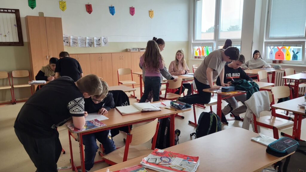 Tak trochu netradičně si děti ze 6.B v hodině angličtiny sesbíraly informace o slavení svátku velikonočním ve Velké Británii. Po rozdání pracovních listů s otázkami, jejich přečtením a přeložením si je, se žáci rozdělili do dvojic, které spolu musely spolupracovat. V namáhavé běhací práci se děti střídaly – jeden si vždy vybral otázku, na kterou měl co nejrychleji najít odpověď. Odpovědi na otázky byly napsány v 9 velikonočních vejcích, které byly rozmístěny po celé chodbě . Úkolem jednoho žáka ze dvojice bylo co nejrychleji zjistit odpověď na otázku, se kterou se pak vracel na ” základnu” a tam ji sdělil svému spolupracovníkovi. Poté se role vystřídaly. Ne všem se podařilo najít všechny odpovědi, ale všichni se je nakonec dozvěděli. Na závěr jsme si pustili video, ve kterém se zobrazovaly symboly a tradice tohoto svátku v Británii. Děti si hodinu užily – protáhly si těla, zasoutěžily si mezi sebou a ještě se něco dozvěděly.