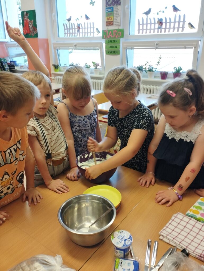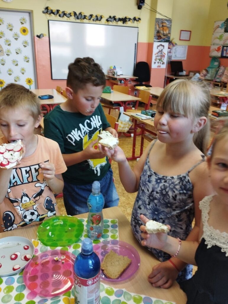 V minulých dnech jsme si v čítance přečetli recept na chutnou svačinu. Dnes jsme podle tohoto receptu pomazánku “uvařili”. Pokyny přidej, krájej, omyj, míchej, dávej pozor se rychle střídaly tak, jak jsme se my střídali u přípravy dobrůtky. Šlo nám to pěkně od ruky, a to dokonce i s nožem. Krájet pažitku i ředkvičky si chtěl vyzkoušet každý. Nakonec se solilo, trochu cukru ještě a první odvážlivci mohli ochutnávat. Svůj chléb si každý namazal sám a ozdobil podle své chuti: pažitka, ředkvičky, sedmikrásky. Popřáli jsme si dobrou chuť a směle se pustili do jídla. A kdo se ptá, jestli nám chutnalo, nechť se podívá na fotografie.