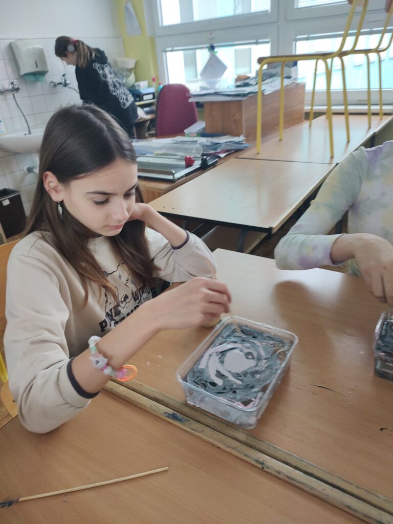 Poslední lekce duhové dílny v kalendářním roce 2022 byla samozřejmě ještě ve znamení Vánoc. Tentokrát se s námi naše vyučující pustila do techniky, která i jí samé byla dosud prakticky neznámá (znala ji jen z videí). S vidinou nejistého výsledku jsme se pustili do techniky mramorování. Spíše než překrásný výsledek byl tentokrát zajímavý celý proces výroby. Toto kouzlení s barvami na vodní hladině nebylo vůbec jednoduché a rozhodně šlo o techniku pro pokročilejší tvořílky. Právě proto nám musela přijít na pomoc i další vyučující – paní učitelka Trhlíková. I přestože proces byl náročný a neobešel se i bez nezdarů a hlavně spousty nepořádku, každý z nás si nakonec odnesl druhý den velice neobvykle dekorovanou ozdobu. A jelikož to není technika, kterou zvládnete napoprvé, rozhodně se k ní budeme ještě muset vrátit a procvičit se v ní.