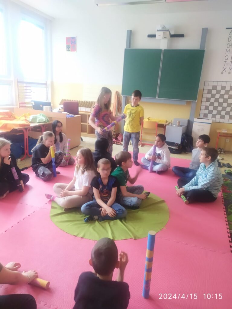 Již podruhé nás navštívil pan Petr Swaraj Broniš se svými netradičními hudebními nástroji a muzikofiletikou, díky které máme možnost vnímat hudební výchovu trochu jiným, specifickým způsobem. Ke hře využíváme nejrůznější nástroje, ke kterým není potřeba být stoprocentním hudebníkem a přesto umíme znít. Učíme se díky filetickému přístupu hudbu vnímat a především prožívat. Stáváme se muzikanty, sdílíme své pocity s ostatními a tím budujeme a prohlubujeme i vztahy mezi sebou. Při druhém setkání jsme měli možnost využít vlastnoručně vyrobené deštné hole, poznat příjemné zvuky fujary, dunivé djembee, ale i jemné tóny koshi zvonků. Už teď se těšíme na další nezapomenutelné zážitky.